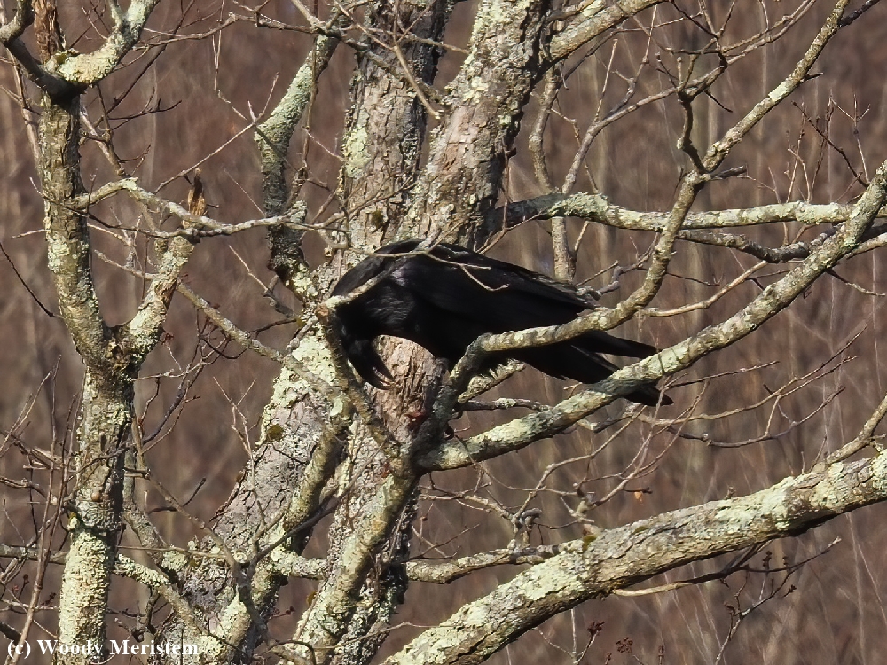 No eagles, but on the far side of another valley we saw a common raven land in a tree. It payed us no mind when we stopped; out came the camera to rest on a beanbag placed on the car’s window ledge. The raven was feeding on something, holding it between its feet as it pulled off pieces to swallow.